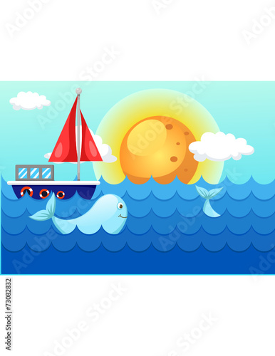 © Wichittra Srisunon, Naklejka premium landscape sea waves with whale and boat