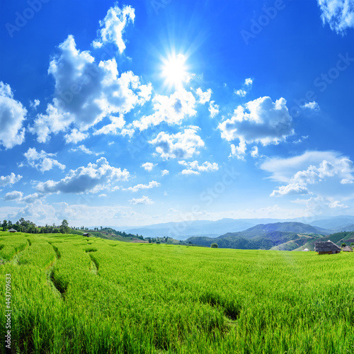 Fototapeta premium landscape Terraced Green paddy Rice field with bamboo hut, Chiang Mai, Thailand