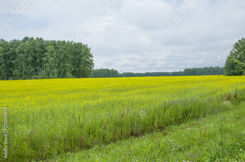 Fototapeta premium Landscape the field with yellow flowers against the background of trees