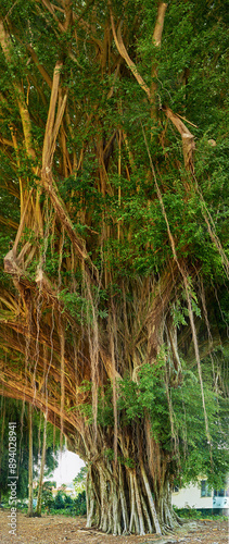 Fototapeta premium Landscape, tree and nature in Hawaii with leaves for geology, sustainability and tropical vacation. Woods, biodiversity and banyan species in forest on island for travel and tourism with environment