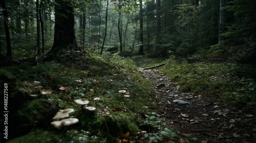 © Adi, Fototapeta premium Landscape, very dark and densely wooded forest, deciduous trees, ings and mushrooms on the ground, on small footpath winding through