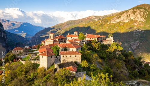 © wanna, Obraz premium Landscape view of a picturesque European mountain village with a church and houses, overlooking the sea