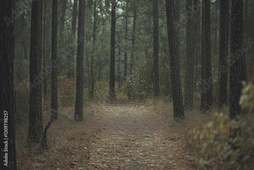 © Chin, Fototapeta premium Landscape view of deep dark forest with path into the wood, Forest view at dusk time.