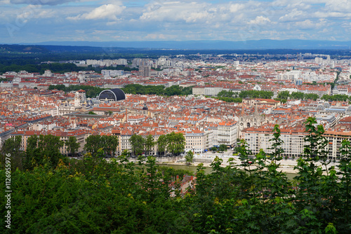 Obraz premium Landscape view of downtown Lyon seen from the Basilica of Notre Dame of Fourvière.