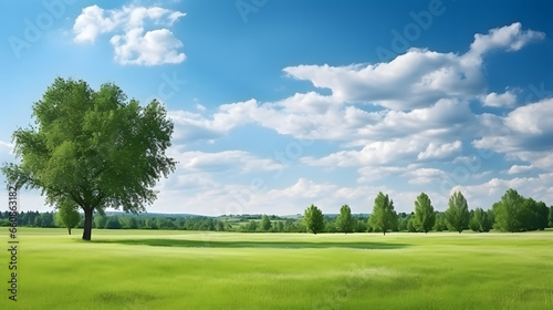 © Planetz, Naklejka premium Landscape view of green grass on slope with blue sky and clouds background.. natural scenic panorama green field