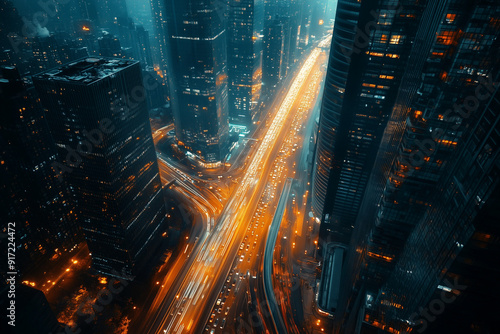 © Chin, Fototapeta premium Landscape view of long exposure civilization highway in town, Traffic light on road with tall building in downtown.