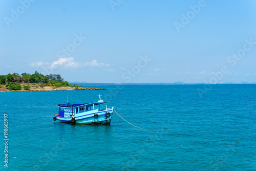 © yanadhorn, Naklejka premium landscape view of seascape and skyline in the ocean with fishing boat and island.