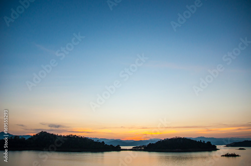 © komjomo, Fototapeta premium Landscape view of tranquil mountain and lake at sunset