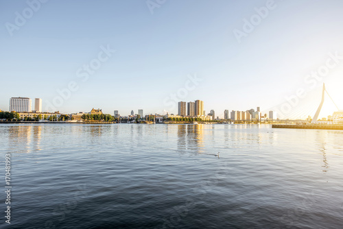 Fototapeta premium Landscape view on the beautiful riverside with skyscrapers and bridge during the morning in Rotterdam city