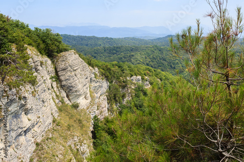 Obraz premium landscape view with high white rocks and pine tree branches and greenforest