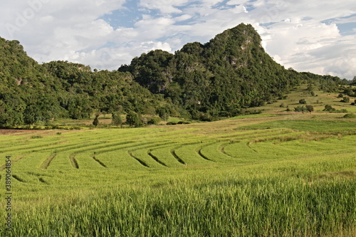 Fototapeta premium Landscape view with rice fields near Pauk Tu village. Shan state. Myanmar. Asia.