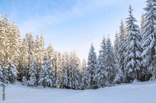 © Vitalii_Mamchuk, Naklejka premium Landscape winter forest in cold sunny day. The fluffy pine trees covered with white snow. Wallpaper snowy background. Location place Carpathian, Ukraine, Europe.
