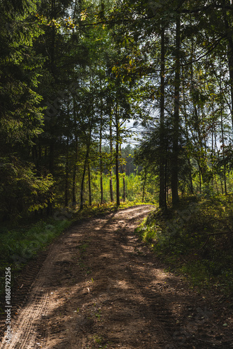 Fototapeta premium Landscape with a dirt road through the forest during a summer sunny day