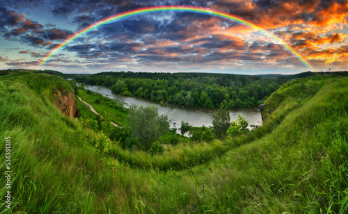 © sergnester, Fototapeta premium Landscape with a Rainbow on the River in Spring. colorful morning. nature of Ukraine