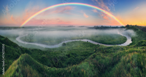 © sergnester, Obraz premium Landscape with a Rainbow on the River in Spring. colorful morning. nature of Ukraine