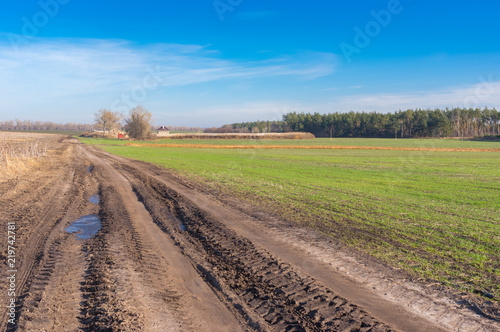 Naklejka premium Landscape with agricultural fields and dirty road leading to remote farm-stead in central Ukraine at late autumnal season