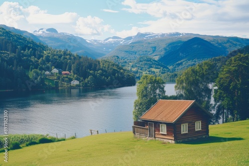 © ArtSpree, Naklejka premium Landscape with an old village house standing in a field with autumn-yellowed grasses against a cloudy sky. Rural area.. Beautiful simple AI generated image in 4K, unique.