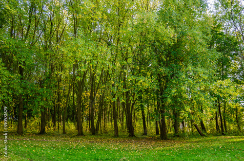 Obraz premium Landscape with autumn forest in the sunny day. Yellow and green forest in the fall season.