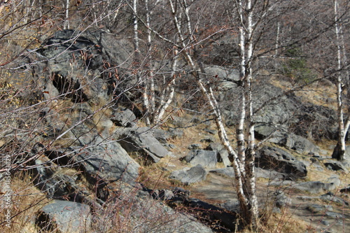 © Maxtetis, Obraz premium landscape with auutmn trees and small rocks in tienshan mountains