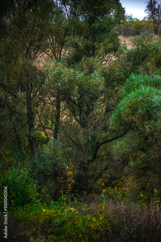 Naklejka premium Landscape with beautiful and mystery trees, yellow and orange leaves on...
