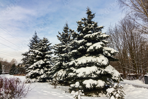 Fototapeta premium Landscape with blue fir trees on a blue sky background in the park on a clear...