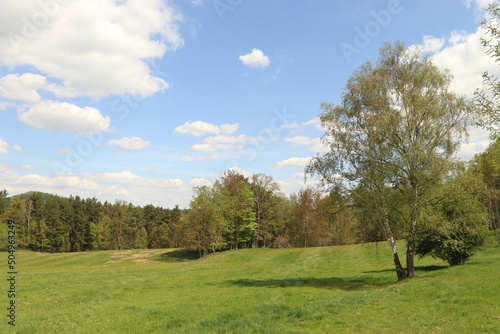Obraz premium landscape with blue sky and white clouds, meadow, forest and tree in the...