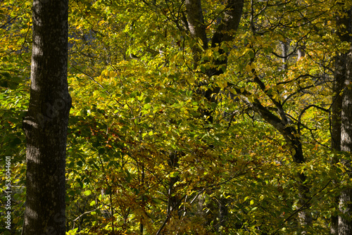© Emils, Fototapeta premium Landscape with colorful autumn birch tree leaves.