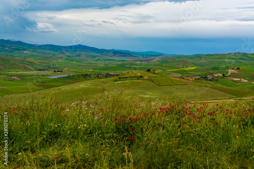 © barmalini, Fototapeta premium Landscape with colorful blossoming pastures and fields, honey flowers sulla from Sicily, agriculture in Italy