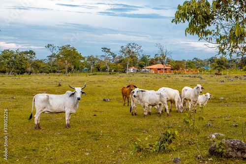 © Bergoi, Fototapeta premium landscape with cows and cloudy sky