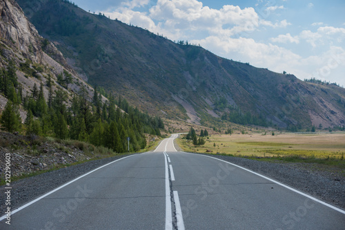 © Михаил Решетников, Fototapeta premium Landscape with empty road and mountains. A road winds through a mountain pass in horizontal perspective