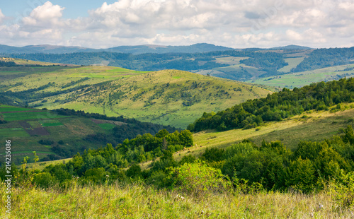 Fototapeta premium landscape with fields and forest on hillside. lovely foggy sunrise in mountains