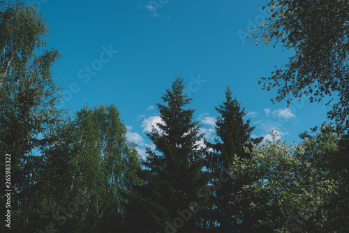© eskstock, Obraz premium Landscape with fir forest in vintage retro style.