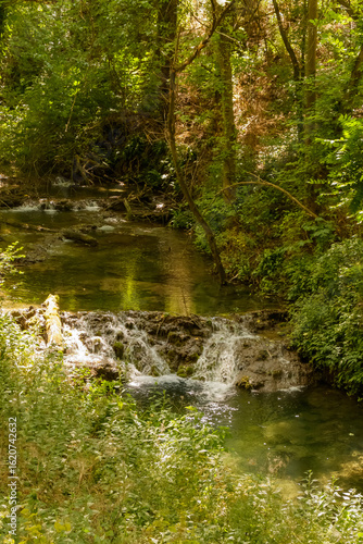 © Miroslav, Naklejka premium Landscape with gentle waterfall flowing through lush green forest in afternoon light