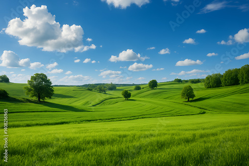 © Alla, Fototapeta premium landscape with green field and blue sky