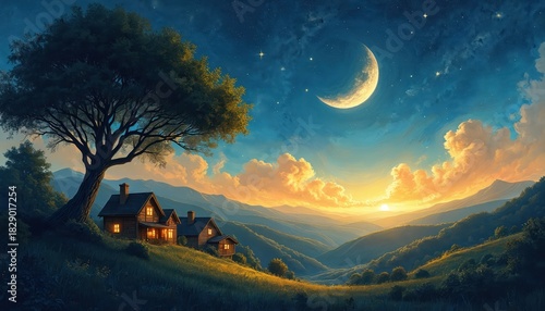 © miss irine, Naklejka premium Landscape with houses and large tree under half moon at starry night. Sunrise over mountain hills, idyllic scene. Night sky with clouds. Village houses with windows glowing in dark.
