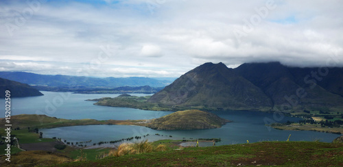Naklejka premium Landscape with lake and cloudy sky, New Zealand