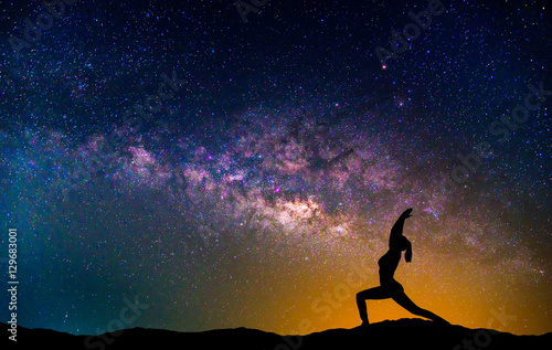 © nuttawutnuy, Naklejka premium Landscape with Milky way galaxy. Night sky with stars and silhouette woman practicing yoga on the mountain.
