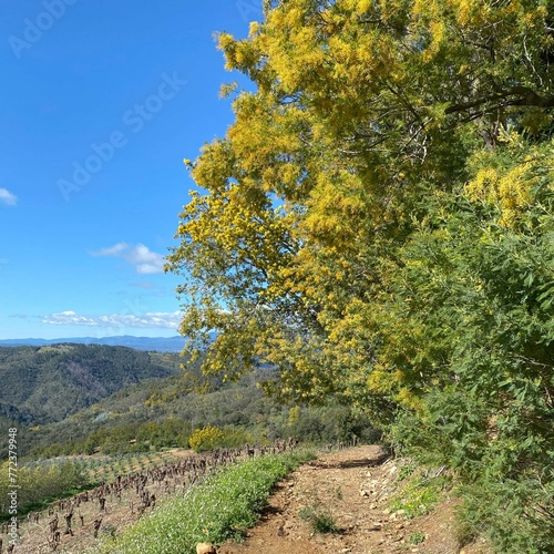 Fototapeta premium Landscape with mimosa trees and eucalypthus fields