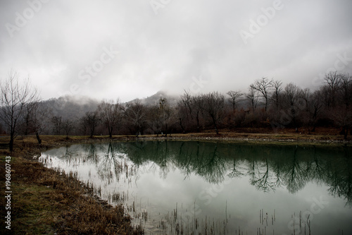 © zef art, Fototapeta premium Landscape with misty morning fog in the Forest Lake or Beautiful forest lake in the morning at winter time. Azerbaijan nature.