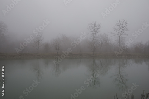 © zef art, Fototapeta premium Landscape with misty morning fog in the Forest Lake or Beautiful forest lake in the morning at winter time. Azerbaijan nature.