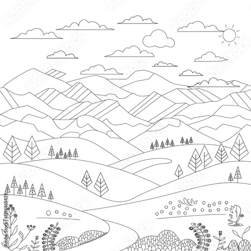 © Sabit, Obraz premium landscape with mountains and houses coloring page