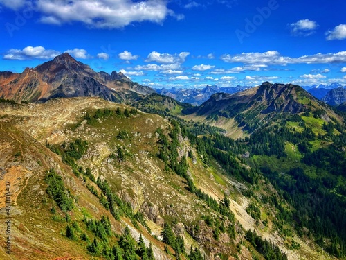 © Stephanie, Obraz premium landscape with mountains, blue sky and trees
