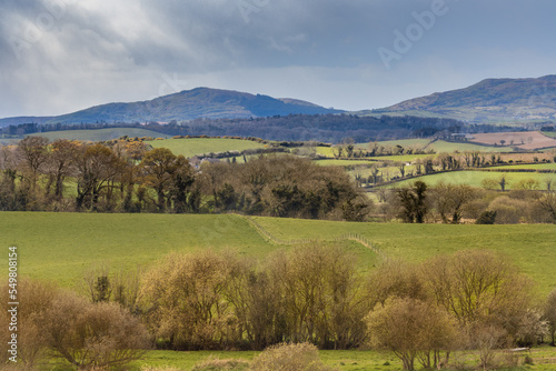 © M Temes, Naklejka premium Landscape with mountains, green fields and trees. Panoramic view of the Mourne Mountains. Northern Ireland, UK