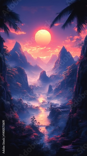© atik, Fototapeta premium Landscape with mountains water reflection sunset sky purple and orange colors.