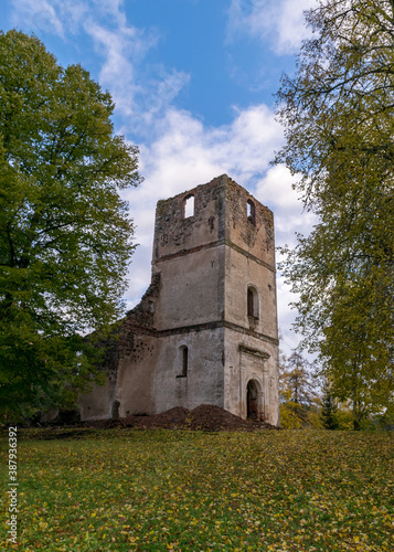 © ANDA, Naklejka premium landscape with old church ruins, ruins overgrown with bushes and grass, autumn time, Ergeme Evangelical Lutheran Church was one of the most beautiful churches in Latvia
