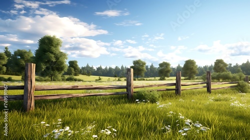 © Saba, Fototapeta premium Landscape with old wooden rustic fence. meadow in the background.