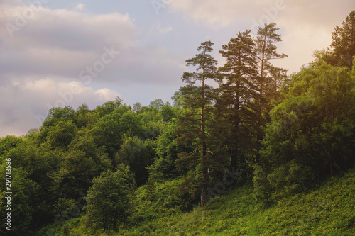 Obraz premium Landscape with pine forests in the mountains slope in summer on sunset