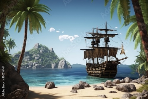 Fototapeta premium Landscape with pirate ship on an island, fanta concept. Generative AI