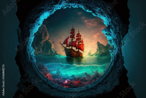 © Deivison, Naklejka premium Landscape with portal in the sea with pirate ship and island in the background. Generative AI