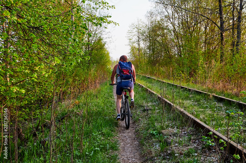 Obraz premium Landscape with railway, trees, grass and cyclist. Nature in spring or summer evening